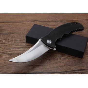 月牙快开折刀 全长:20.2cm 刃长:9.1cm 柄长:11.6cm 刃厚:0.33cm 刃宽:3.0cm 刃材:D2钢 柄材:全钢 硬度:58HRC 净重:330克(含包装) 锁定:线锁配礼品盒