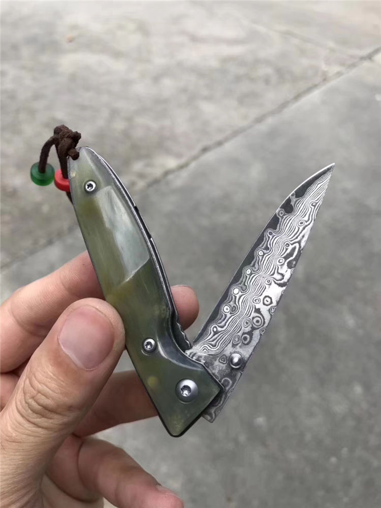 钥匙刀,柄材采用纯天然野生黑牛角与黄牛角材质制造,手工打磨抛光搭配日本夹层大马士革VG10钢,搭配阿根廷进口纯收工缝线雕花皮套