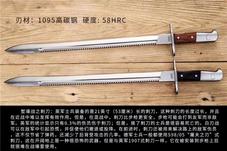 一战瑞士1914式屠夫刺刀 全长:60.5cm 刃长:47cm 柄长:12.5cm 刃材:1095高碳钢 柄材:钢+红酸枝木-黑檀木(下单注明) 刀鞘:420J钢 刃厚:6MM 刃宽:3MM 表面:砂光 硬度:58HRC 重量:1006g 一战屠夫刺刀,刀如其名!凶悍无比,比枪炮更有威慑力!即使被枪炮干死,也没有人愿意死于屠夫刀下! 瑞士1914刺刀,一战原品一比一复刻,百分百还原细节 ,钢质之精良足以傲笑古今! 瑞士屠夫刺刀,刀刃端部肥大,适合砍劈。被称为“屠夫之刃”的就是这款刺刀