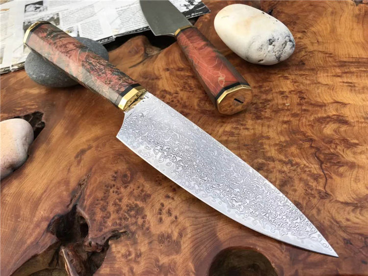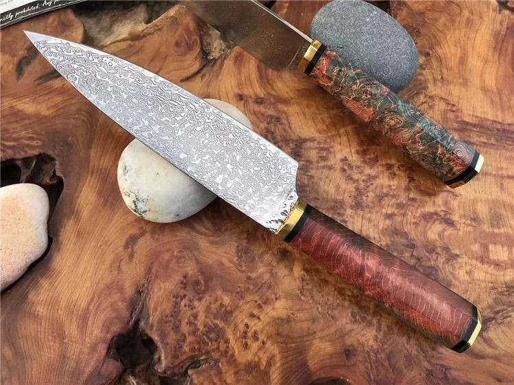 大马士革厨星之刀,采用高端稳定固化颜色木手柄(木材纹路把把不同,与实物为准)大马士革VG10钢心,超级锋利耐用厨房必备神器