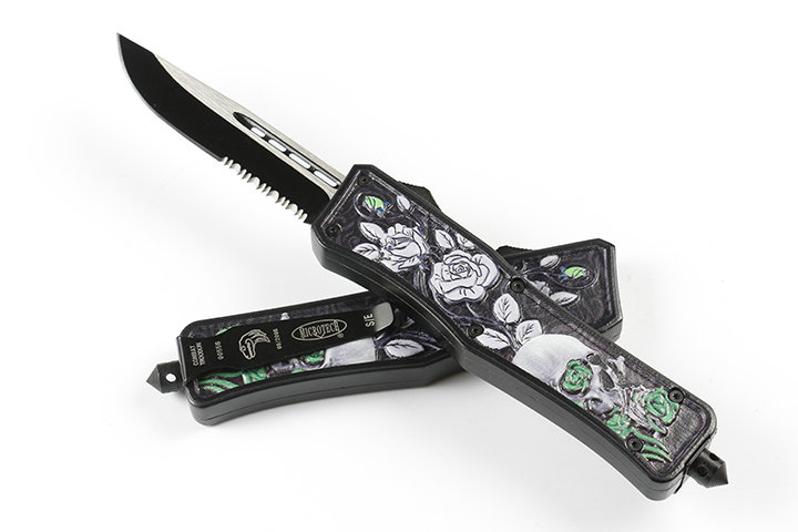 微技术F型玫瑰图直弹刀 类型:直出弹簧刀 品牌:MICROTECH微技术(仿品) 开启长度:24.0CM 合起长度:14.2CM 刃长:9.8cm 刃厚:0.3CM 硬度:57HRC 刃材:440 表面:刀刃发黑伴拉丝 把手:锌铝合金 净重:240克(整刀) 毛重:345克(含包装物) 开合:双动作,直推开关,自动弹出和收回 包装:耐磨专用战术尼龙套 口袋刀夹:弹簧刀夹 玻璃敲击器:钨质玻璃敲击器,共6种刀刃,下单请注明,谢谢