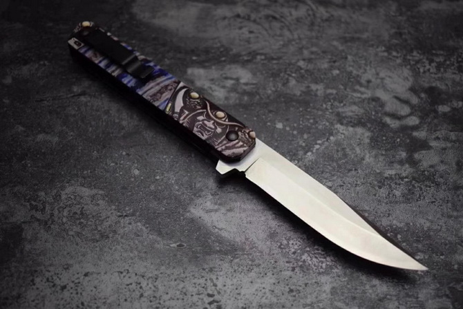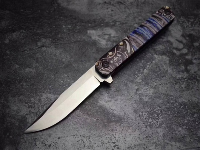 苏科特鬼武士折刀 类型:折刀 全长:22cm 刃长:9.5cm 柄长:12.5cm 刃厚:0.46cm 刃宽:2cm 刃材:9CR18MOV 柄材:钢片+3D打印 硬度:58HRC 净重:210g 表面处理:砂光 锁定;线锁