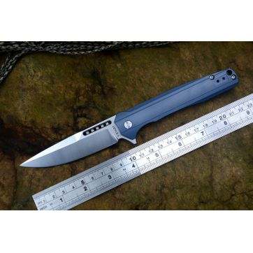 Y-START(随风版)LK5015快开折刀 总长:227mm 刃长:99mm 柄长:128mm 刃厚:4.0mm 刃宽:26mm 刃材:VG-10(真空处理) 刀刃处理:石洗后CNC数控磨 硬度:HRC60-61 柄材:TC4钛合金(镀蓝色) 净重:135g 包装:褐色硬纸盒