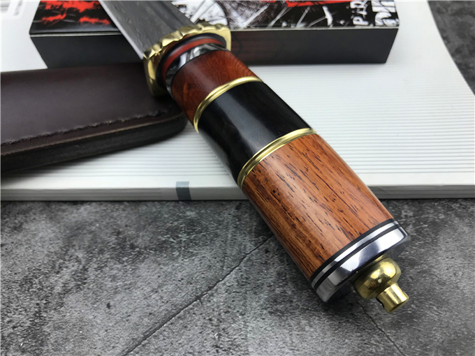 新款手柄隔断16层手工制作用料足,不锈钢大马夹钢VG10钢芯硬度60手柄搭配黄铜+手工挫花隔断+双色G10隔片+黄铜片挖槽+花梨木+酸枝+黑檀木+不锈钢片+黄铜吊坠尾钉,配皮套,刀型点评,手感好,用料做工也下功夫