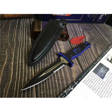 MT双锋半齿直刀 类型: 直刀 全长: 26.6cm 刃长: 13cm 刃宽: 3cm(最宽处) 柄长: 11.5cm 刃厚: 0.45cm 刃材: 440 硬度: 56RHC 表面: 发黑 柄材: 双色G10,经电脑锣精加工防滑格纹 重量: 240克(含套) 其他:皮套