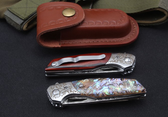 柄材:三D钢头花纹+天然酸枝木和鲍贝两款式