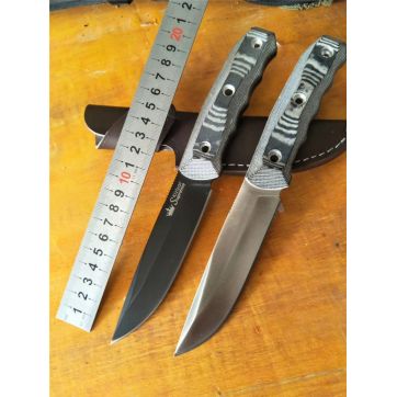 皇冠户外战斗刀 总长:23.3cm 刃长:11.5cm 刃厚:5MM 刃宽:2.5cm 钢材:440 硬度:57HRC 热处理:真空深冷热处理 表面处理:砂光效果 柄材:米克塔 皮套:仿皮