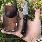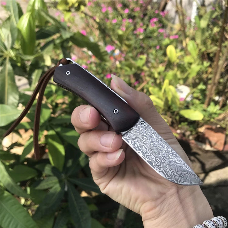 大马士革炎皇折刀 全长:13.6cm 刃长:5.8cm 柄长:7.8cm 刃厚:2.5mm 刃宽:2.0cm 刃材:进口Vg10大马士革钢 硬度:58-60HRC 重量:约115克(含包装) 表面:锻打大马士革祥云花纹原色 柄材:非洲黄檀木+不锈钢雕花+铜轴贴片 配送:高级礼品盒+雄狮皮套+牛皮绳