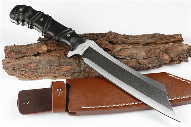 丛林之狼直刀 品牌:丛林之狼 全长:29.0cm 刃长:18cm 柄长:11cm 刃材:9CR18MOV 硬度:58 表面:精细沙光加黑钛石洗伴拉丝 刃厚:0.6cm 柄材:全CNC电脑锣一体全钢手柄,两边爽天然黑檀木. 刀重:332克 总重:440克 刀鞘:高密真皮套 其他:刃口锋利,原厂包装.全刀是CNC线切割,采用9CR19MOV钢材 品质:出口品质,贴牌代工