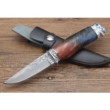 北欧狮头猎刀 全长:228mm 刃长:98mm 柄长:129mm 刃宽:2.5mm 刃厚:3.1mm 刃材:大马士革 重量:409g(含包装) 硬度:58HRC 表面:大马士革原纹 柄材:双钢头雕花狮头+固化木 锁型:定锁 其他:配牛皮套礼品盒注每把固化木颜色纹路不样的