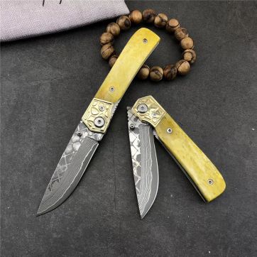 复古款纯手工大马士革小折叠刀、雕花钢头手柄+染色天然牛骨搭配