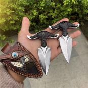 大马士革牛魔王手刺 全长:12cm 刃长:7cm 手柄:5cm 刃宽:3.4cm 厚度:3.2mm 钢材:进口锻造大马士革钢 硬度:60HRC 柄材:名贵黑檀木手工雕刻凹凸纹理 皮套:意大利进口优质手工雕花皮套镶嵌蛇皮 包装:手工礼盒包装 进口锻造大马士革钢(90层)真空热处理,硬度60HRC,表面雕刻双条气槽非常霸气,手柄搭配名贵黑檀木,手工雕刻表面不规则凹凸花纹,防滑耐磨性极高