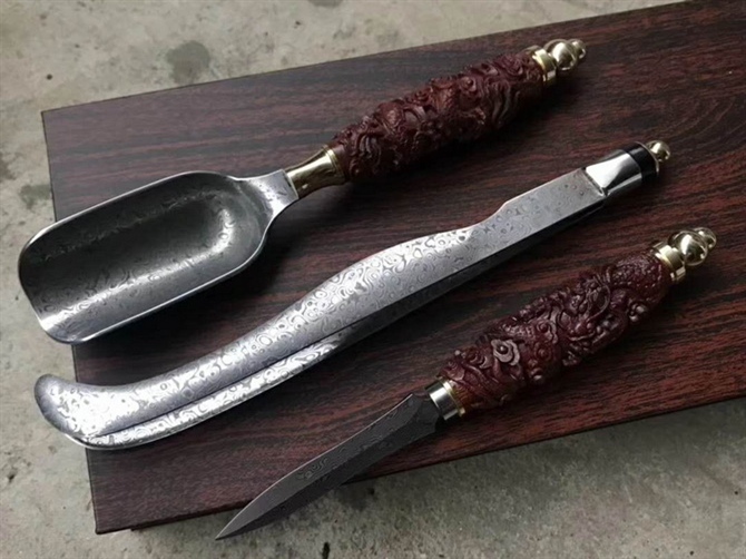 大马士革檀木龙雕三件套装茶刀 茶针约总长:16cm 刃长:6.5cm 刃厚:2.5mm 茶勺约总长:17cm 勺钢长:8cm 厚度:2mm 茶夹约总长:18cm 厚度:2mm 钢材:大马士革钢 硬度:59HRC 表面:大马士革原纹 柄材:精选檀木精雕龙 包装配置:高级礼品硬盒 老师傅·纯手工打造,科檀木精雕手柄,高档品茶用具之一,喜欢泡茶的老铁们,不要错过哦