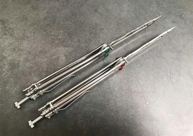 JL-23A甩刀 全长:21CM(打开) 刃长:0.9CM 刃厚:0.3CM 刃材料:420 材柄:420 硬度:58 重量:180克 刀鞘刺绣尼龙刀鞘 铸钢柄镂空,压弹出刀 包装高级纸盒