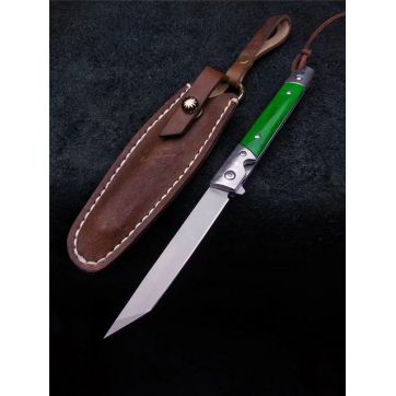 搭配翡翠质感骨片和大马士革钢双钢头,陶瓷滚珠轴承快开系统,自主设计开发,刀刃选用奥地利M390粉末钢,中轴配置两颗进口陶瓷轴承结构,开合顺畅。专业真空深冷热处理,高温油淬回火,硬度达到60-61HRC。配置手工缝线头层牛皮刀鞘