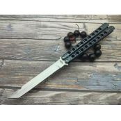 一体柄荣光之刃蝴蝶甩刀(碳纤迷彩) 全长:29CM 刃长:13.5CM 刃厚:0.3CM 刃材:440C 硬度:58 柄材:不锈钢压铸,碳纤迷彩 重量:200克 刀鞘:尼龙套 非常凶悍,29CM超长款式,一体柄型,更坚固和耐摔,转动灵活,由THEONE出品,不可多得的精品甩刀