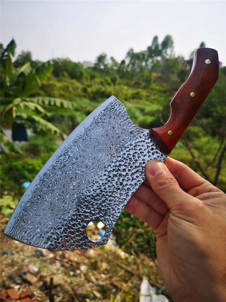大马士革猛牛砍骨厨刀 总长:300mm 刃长:180mm 刃厚:4.5mm 刃宽:95mm 净重:525克 硬度:60—61HRC 包装:手工黑色盒子包装 日本进口VG10钢芯锻造大马士革钢97层,真空深冷油淬热处理,锋利度级别:国际一级锋利标准,食品级安全检查,柄材;进口黄檀木嵌片,三颗黄铜铆钉固定