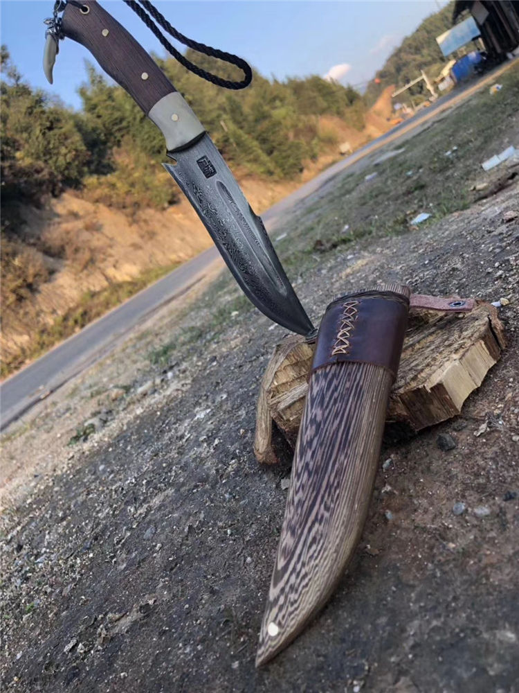 高端袭击户撒刀 全长:28cm 刃长:14.8cm 刃宽:3.5cm 刃厚:0.4cm 柄长:11.5cm 挂件:狼牙 钢材:折叠缎打高端花纹钢 柄材:上等鸡刺木+鹿角一体刀身制作 木鞘:上等鸡刺木制作马棕加固 手工牛皮兜,每一道工序都是纯手工制作,老师傅二十年经验值得拥有 折叠花纹钢小弯刀,老客户咨询优惠,一款非常帅气刀,是每个人值得拥有!每一把都是精品、你看到的收到的都让你满意,真空热处理深冷