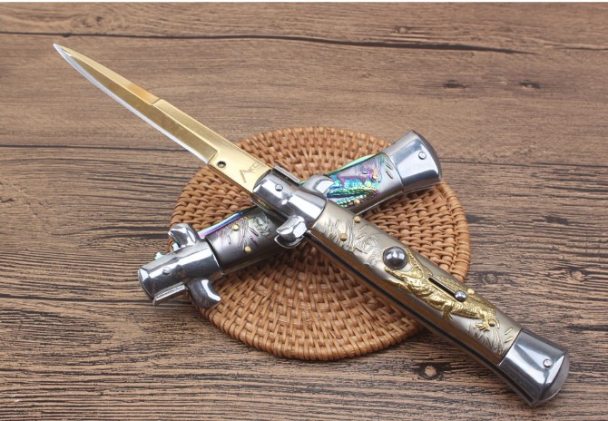 11寸扎花鳄鱼黑手党跳刀 全长:24.7CM 刃长:10.7CM 柄长:13.8MM 刃厚:3.0mm 刃材:440 刀柄:钛金扎龙图案凸起立体 开刀方式:弹簧 重量:193克配尼龙套彩盒可削纸超锋利 2019新款11寸AKC意大利黑手党-赌徒跳刀,在电影"教父"里出尽了风头!枪刺刃的黑手党侧跳,柄,弹力超强,锁定到位,440枪刺刀刃镜面,带有保险装置,刀护手处暗藏闭合开关,出口产品,质量保证!满足把玩和收藏需要