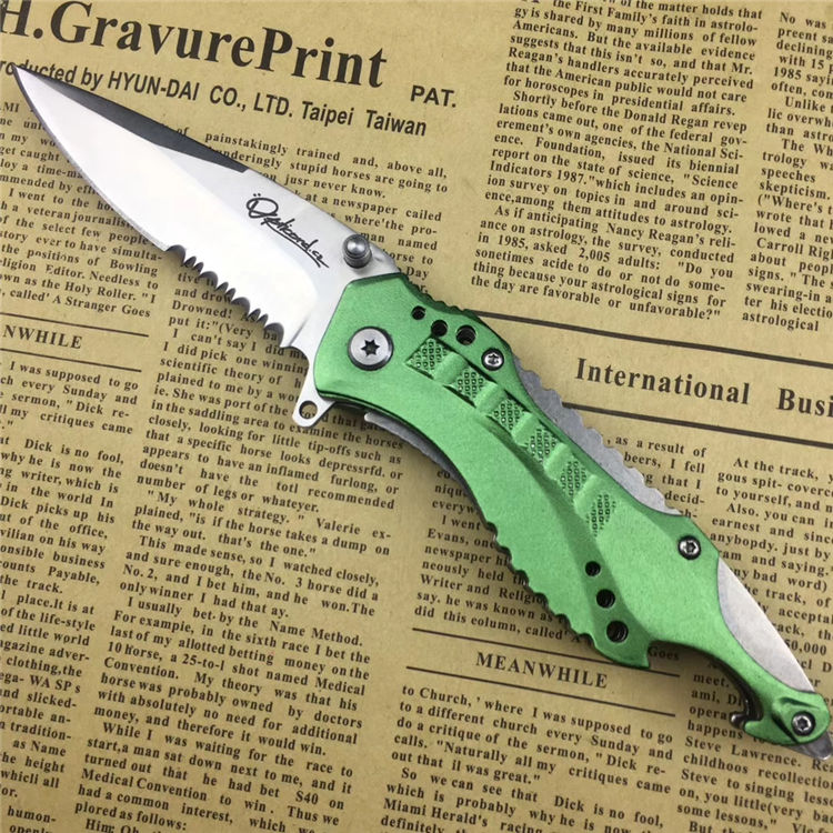 出口齿轮小折刀 全长:203mm 刃长:83mm 柄长:119mm 刃宽:27mm 刃厚:3.0mm 刃材:7Cr17Mov 重量:123g (含包装) 硬度:58HRC 表面:镀钛+沙光 柄材:全钢柄 其他:纸盒包装 带玻璃撞击,开瓶器