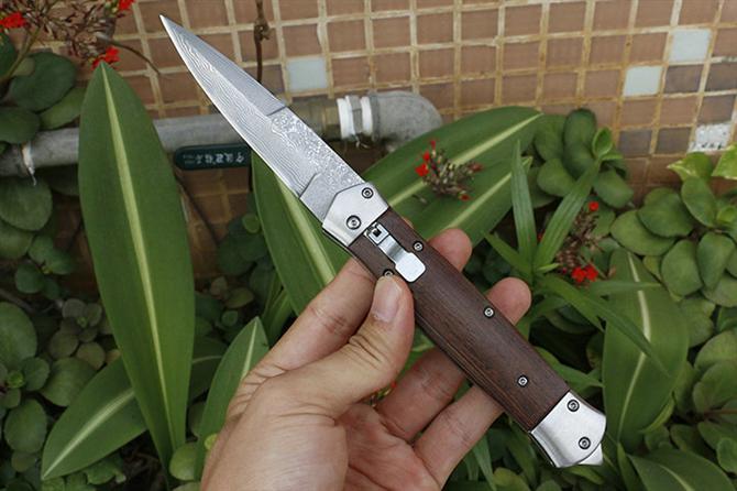 大马士革F125横出跳刀 品牌:自由狼 全长:22.8cm 刃长:9.3cm 柄长:13.5cm 刃宽:2.1cm 刃厚:2.9mm 刃材:VG10大马士革钢 重量:185g(含包装) 硬度:57HRC 表面:大马士革原纹路 柄材:鸡翅木 锁型:弹簧刀 其他:配尼龙套和彩盒+内置撞玻器,可以击穿汽车玻璃