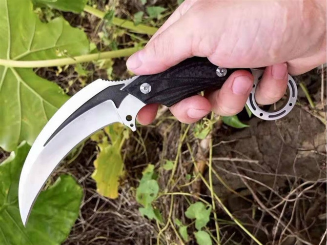 高端材料进口DC53模具钢、碳纤维手柄,真空油淬热处理技术,硬度可达61HRC保持更好的韧性、超级锋利,爪刀中的极品每把刀都有独一无二流水号001-380