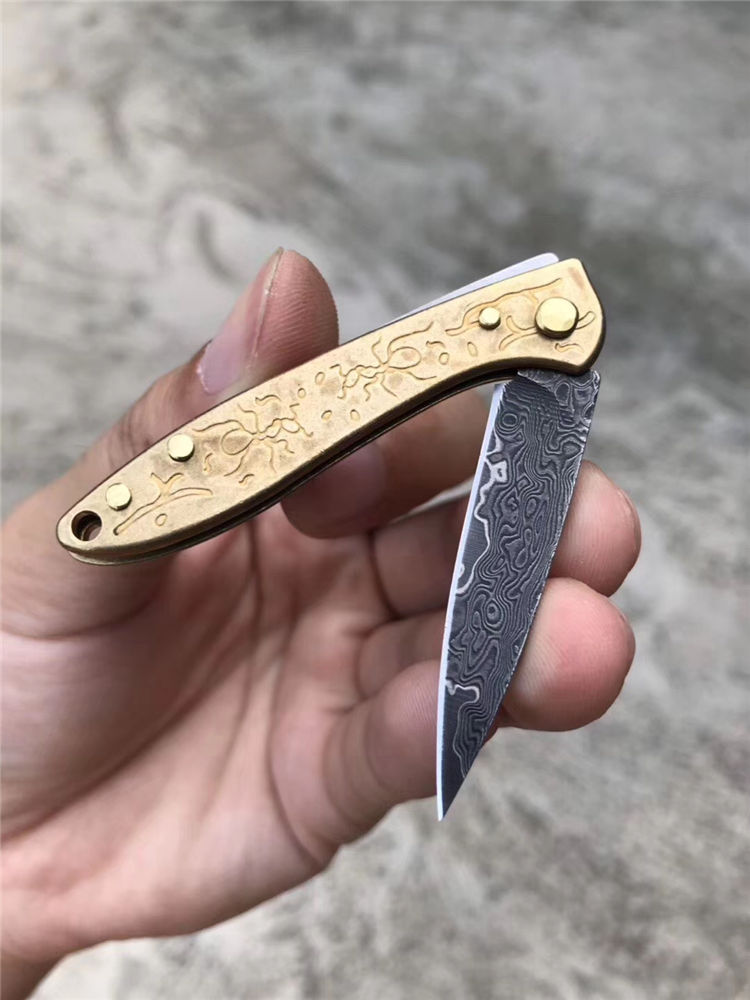 大马士革角斗蚁无锁折刀 总长:11cm 刃长4.5cm 刃厚:2.0 刃宽:1cm 重量:23g 钢材:夹层锻造大马士革钢 柄材:黄铜 表面效果:黑柄纹理层数 包装:盒子包装