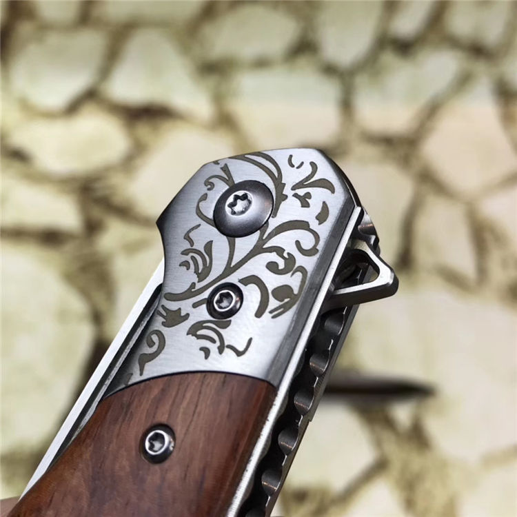 凯龙快开折刀 全长:17.5cm 刃长:7.5cm 柄长:10cm 刃厚:2.0mm 刃材:D2高速钢 硬度:57HRC 刀柄:黑檀与酸枝木 表面:砂光 锁定方式:侧锁 重量:170克