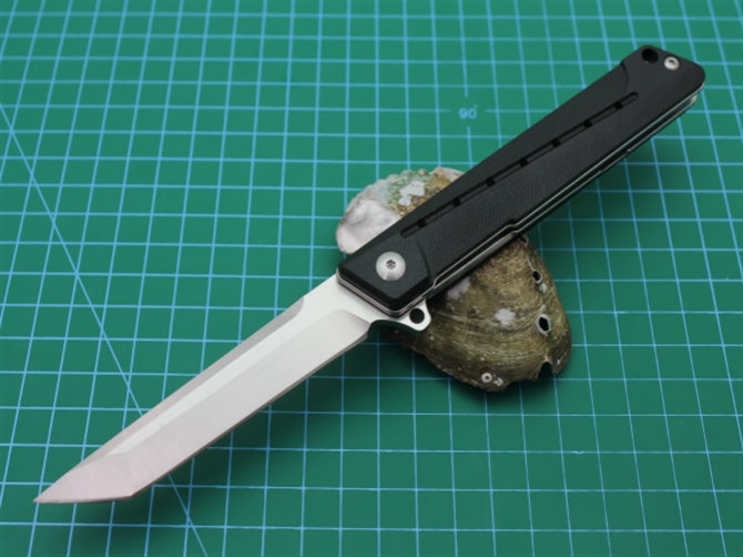必杀武士快开折刀 全长:220mm 刃长:90mm 封闭长度:125mm 刃厚:3mm 表面处理:缎面打磨 重量:188克含包装 材质:D2 柄材:G10 硬度:59-60HRC