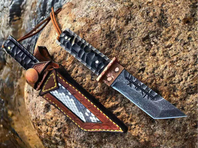 大马士革般若复古小武士刀 总长:15cm 刃长:7cm 手柄:8cm 厚度:3mm 刃宽:4.1cm 钢材:进口锻造大马士革一体钢 硬度:60HRC 热处理:高温真空热处理 开刃方式:手工三道研磨工序 柄材:紫铜护手+雕刻黑檀木 包装:复古皮套+手工小盒 皮套:进口意大利植鞣革皮纯手工雕花镶嵌蛇皮刀套